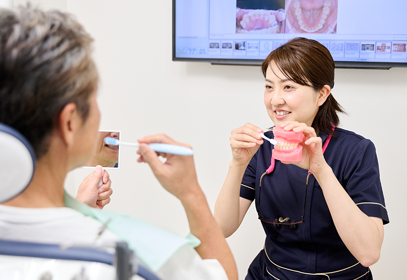 当院では、患者さん一人ひとりに合わせた歯磨き指導を行い、歯ブラシの選び方や磨き方のポイントを歯科衛生士が丁寧にアドバイスします。